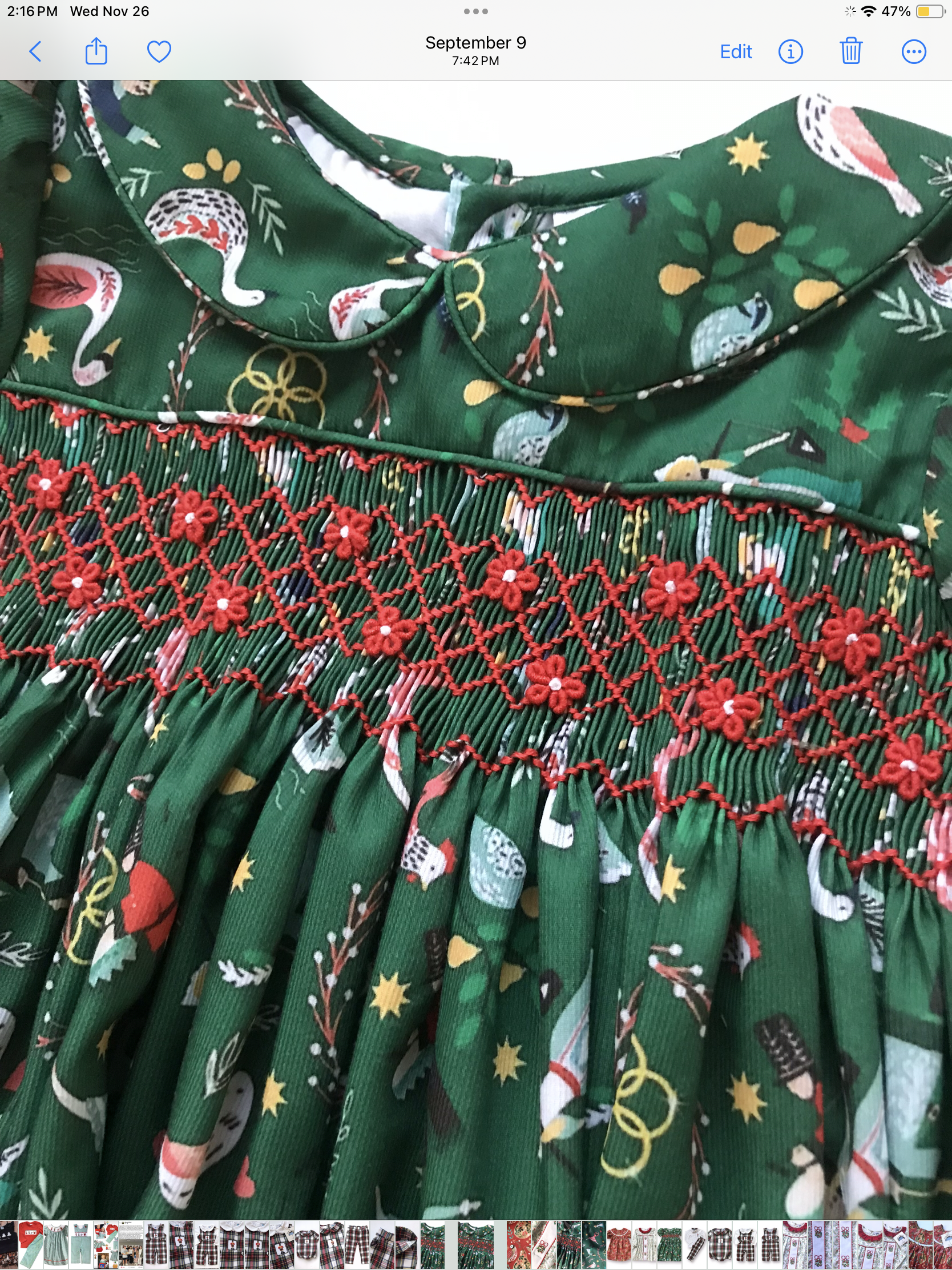 Our 12 Days of Christmas dress features a hand smocked floral pattern across the bodice in Christmas red thread. The adorable fabric sings the love song of mama geese, French hens and turtle doves, golden rings, drummer boys, and milking maids. Bring some Christmas cheer to all her holiday events with this adorable smocked dress.