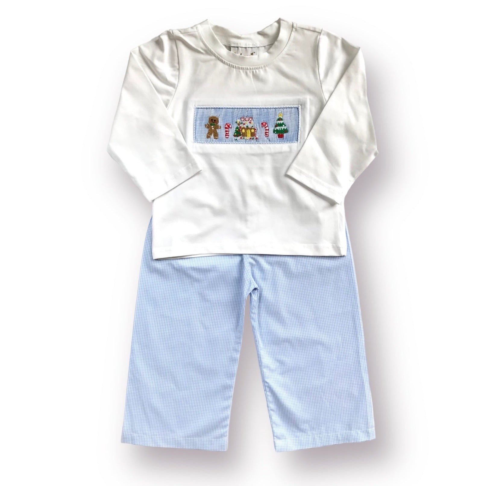 Your little guy will be ready to make sweet Christmas memories in this darling outfit! The Gingerbread Man, a gingerbread house, and a Christmas tree are hand-smocked across the chest. Light blue gingham pants have an elastic waist for easy dressing.